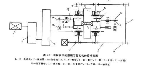 普通型鋼****軋機是在普通二輥軋機的基礎(chǔ)上發(fā)展起來的。圖5-6 所示為一臺中國設(shè)計的型鋼****軋機的傳動簡圖,用于軋制軌梁和大型 H型鋼的****軋機,此軋機有主動的水平軋輾,還有非傳動的立輾。立輾和水平輥在同一垂直平面內(nèi),為能在水平輾軸承座間放置立輥及其軸承座,水平輥的輥頸很小,立輾的開口度由蝸輪蝸桿機構(gòu)調(diào)整,其蝸輪裝在側(cè)壓螺絲的方頭上,其水平輾直徑為帆800~900mm,開口度為140~900mm。較大軋制力水平輥為10000kN,立輥為6000kN,軋制速度為 0.4~9m/s。機架為閉式機架。上下水平輥的壓下裝置為電動,而且上、下輥的兩套壓下裝置間用機械聯(lián)鎖同步;立輥側(cè)壓進(jìn)裝置也為電動。上水平輥及立輥均采用液壓平衡裝置。
